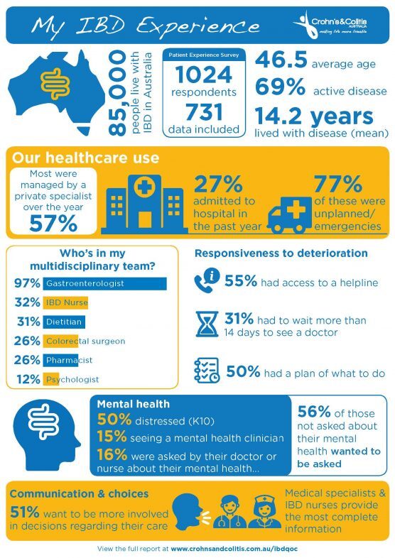 My IBD Experience: Australian inflammatory bowel disease patient experience of health care research report 2018 demonstrates there is a high burden of Crohn’s disease and ulcerative colitis – the two main forms of IBD – in Australia. The patients are commonly young, unwell with active disease and had lived with the condition for more than a decade.