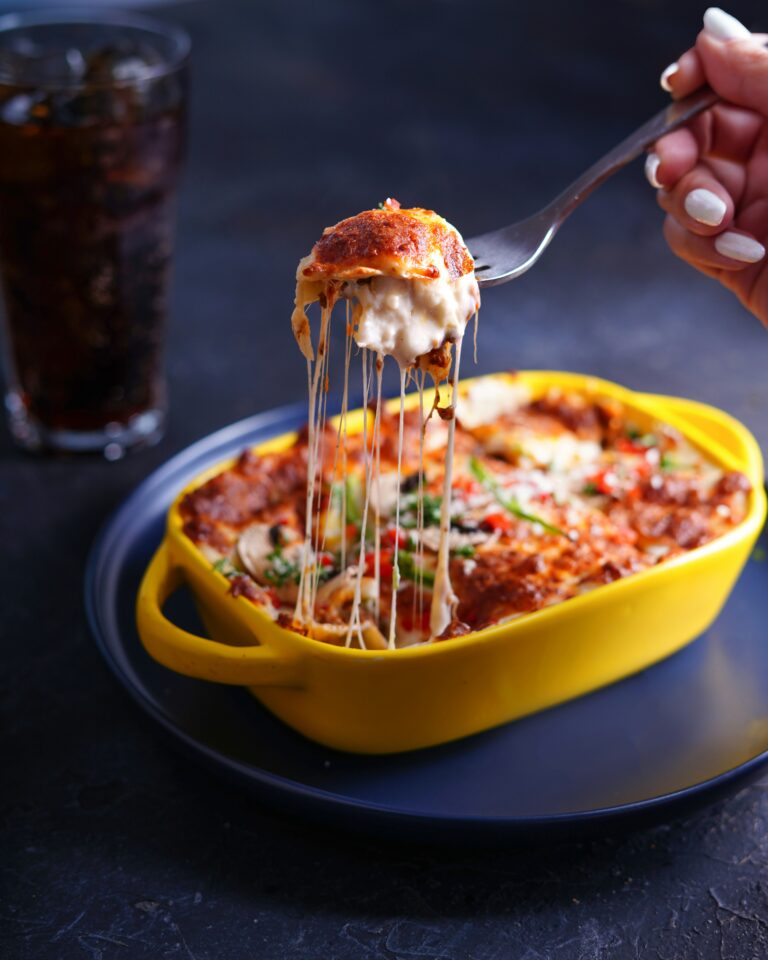 - To assemble the lasagna, pour ½ cup meat sauce into a lightly greased baking dish. Alternate layers of lasagna, meat and cheese sauces, ending with cheese sauce layer.