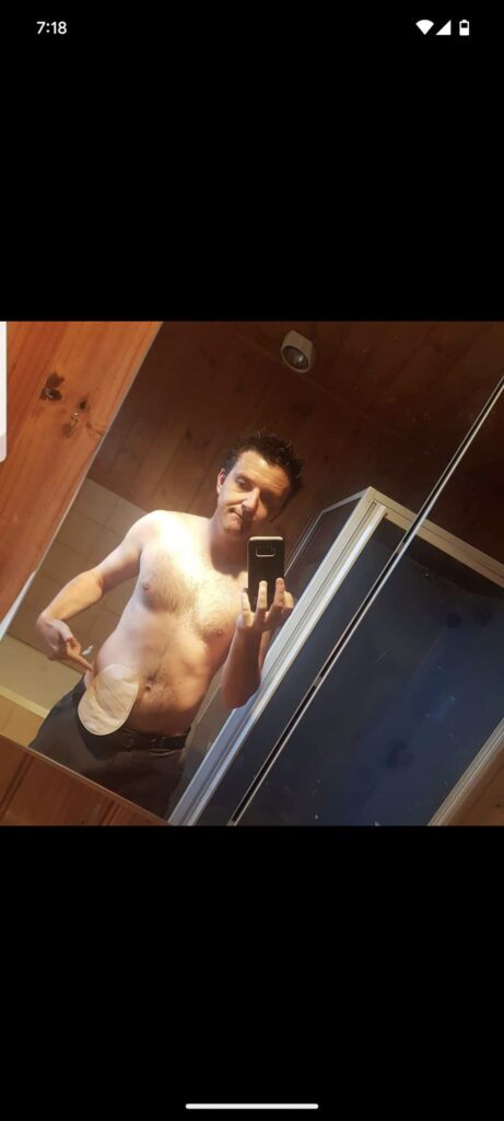 With every week that passed, I was getting better and better. I still hadn’t had any health issues, and by late August, I was back up to 70 kg. It was around the time the Ice Bucket Challenge was happening. My nomination came from Michelle, and I was always going to do it at some stage. The question was: topless with my bag out or with a top on? I went with no shirt, and that was the first public display of me having my bag when Michelle uploaded the video. There was a lot of positive feedback for being willing to be seen with a bag—many people with them try to hide it. I had decided earlier on that I was going to be very open about mine and not hide from the fact I had one.